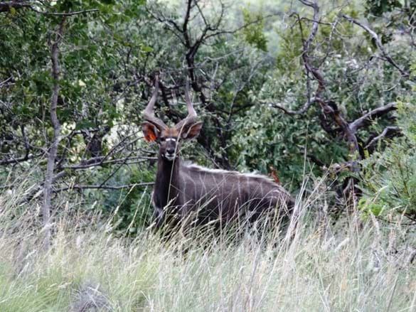 Auf dem gesamten Gelände laufen Wildtiere frei durch die Gegend: Zebras, Giraffen, Kudus, Wasserböcke, Gnus und Nyalas. Bei unseren Spaziergängen standen wir plötzlich neben einer Giraffe, die dann gemächlich von uns davonschwebte. Einige Tiere sind scheu und schon weg, bevor wir sie sehen, und andere lassen uns recht nahe an sich herankommen. Eine kleine Zebraherde fühlt sich von uns gestört und prescht durch das Gras. Auf dem Rundgang durch das Buschland treffen wir keine Menschen, es ist eine Stille, aber eine laute Stille, die Luft ist gefüllt mit Zirpen, Gurren, Pfeifen und Zwitschern.