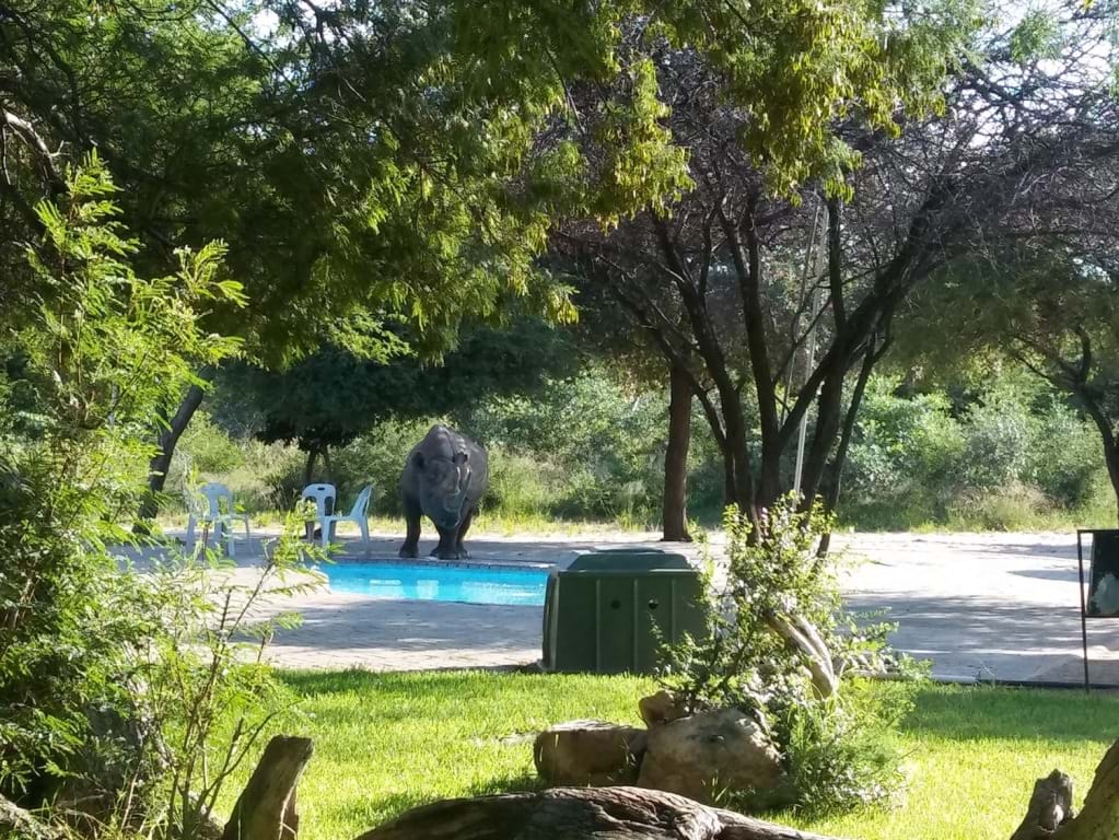 Unser Ziel ist das Khama Rhino Sanctuary: Ein Park, in dem Nashörner geschützt leben. Hier gibt es Übernachtungen in Hütten, Schlafsälen und Campingplätzen, alles etwas spartanisch aber gut für eine Nacht. Am Nachmittag fahren wir durch den doch recht großen Park und entdecken hier und da einzelne Nashörner. Zurück im Camp wollten wir eigentlich in den Pool, aber nö - der ist schon besetzt. Ein großer Nashornbulle steht am Beckenrand und trinkt vom Poolwasser. Da das Camp nicht eingezäunt ist, kann es gut möglich sein, dass am Morgen ein Rhino vor Deiner Tür oder Deinem Zelt steht. Der tut nix, der will nur spielen…