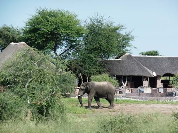 Gegen späten Nachmittag und 50 Kilometer nördlich von Nata kommen wir in der Elephant Sands Lodge an. In dieser kargen Landschaft stehen Chalets und Zelte auf Stelzen großzügig aufgestellt um ein Wasserloch. Auch hier ist nichts eingezäunt und das Camp steht offen für alles und jeden. Es ist ein 16.000 Hektar großes Gebiet, in dem sich Tiere frei bewegen können. Vor allem Elefanten zieht es hierher, angelockt durch das Wasserloch. Und da fällt mir fast der Kaffeebecher aus den Händen als zwei Dickhäuter an unserer Terrasse vorbei schlendern.