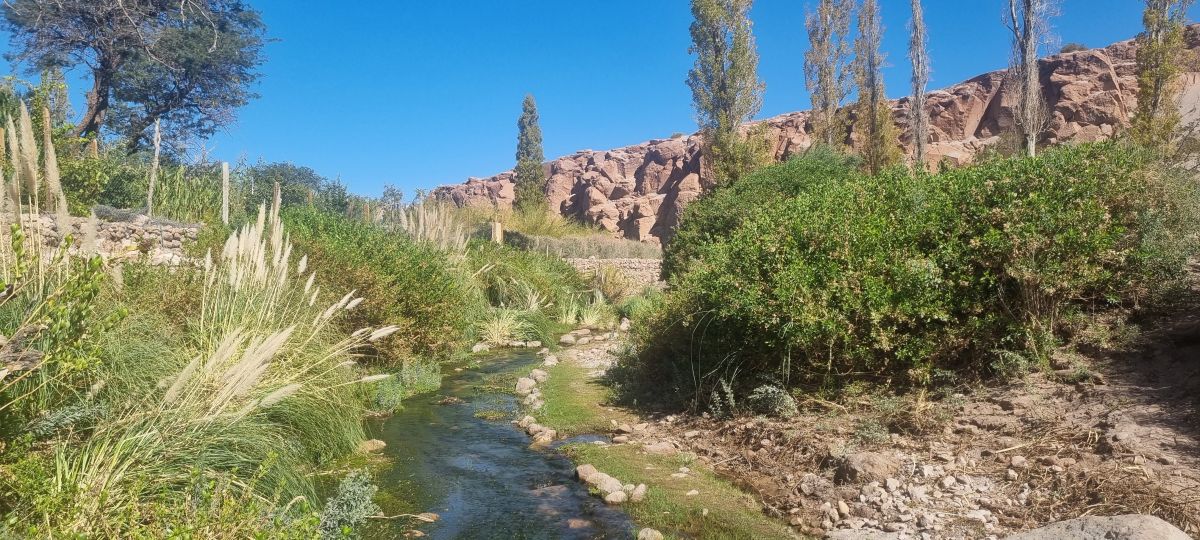 Im Anschluß besuchen wir außerhalb des Ortes Toconao, das Valle de Jere. Mitten in der Ödnis befindet sich ein grünes Tal, nicht groß aber ganz zauberhaft eingebettet von schroffen Felsen. Hier haben Kleinbauern einzelne Parzellen und bauen Gemüse und Obst an, sogar einige Weinreben gedeihen hier. Nun geht es auf eine kurze Wanderung entlang des Tales. Kurz liegt immer im Auge des Betrachters, wir waren über eine Stunde unterwegs und der Weg war nicht gerade easy going. Wieder liefen wir wie die Gemsen am Hang auf einen schmalen Pfad entlang. Ist das nicht gefährlich fragt man sich, ich denke das ist es schon. Immer den Kopf untenbehalten und die Füße richtig setzen.....das wird schon. Die wundervolle Landschaft hat uns für alles entlohnt. Leider konnten wir nicht zum Wasserfall vorlaufen, da der Weg überspühlt war, sehr modrich. Es gab einen winzigen kleinen Fluß mit klarem Wasser, hier hätte ich mich gerne zur Abkühlung hinein gesetzt, leider keine Badekleidung dabei.