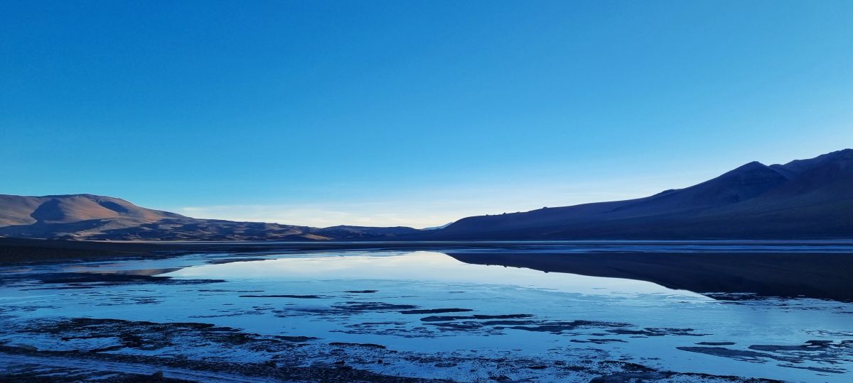 So genug vom Aufstieg, nun ein paar Fakten. Wir überwinden eine Höhe von etwa 2000 Höhenmetern, hier ist die Grenze nach Bolivien auf 4549 Meter. Von der schönen Landschaft sehen wir noch nichts. Wir fahren den Pass der Hoch Puna Landschaft, die zum Teil auf 4700 Meter ansteigt. Nun ist es Zeit unseren ersten Bonbon zu lutschen, mmm lecker, schmeckt ganz gut. Als langsam die Sonne aufsteigt sind wir nach 1,5 Stunden am Salar de Talar angekommen. Bei sage und schreibe -4 Grad, aber wir sind vorbereitet, alles aus Patagonien kommt hier noch einmal zum Einsatz. Es ist einsam hier oben und wir sind ganz für uns, wie wunderbar, hinter uns schleicht ein Fuchs den Berg hinauf.