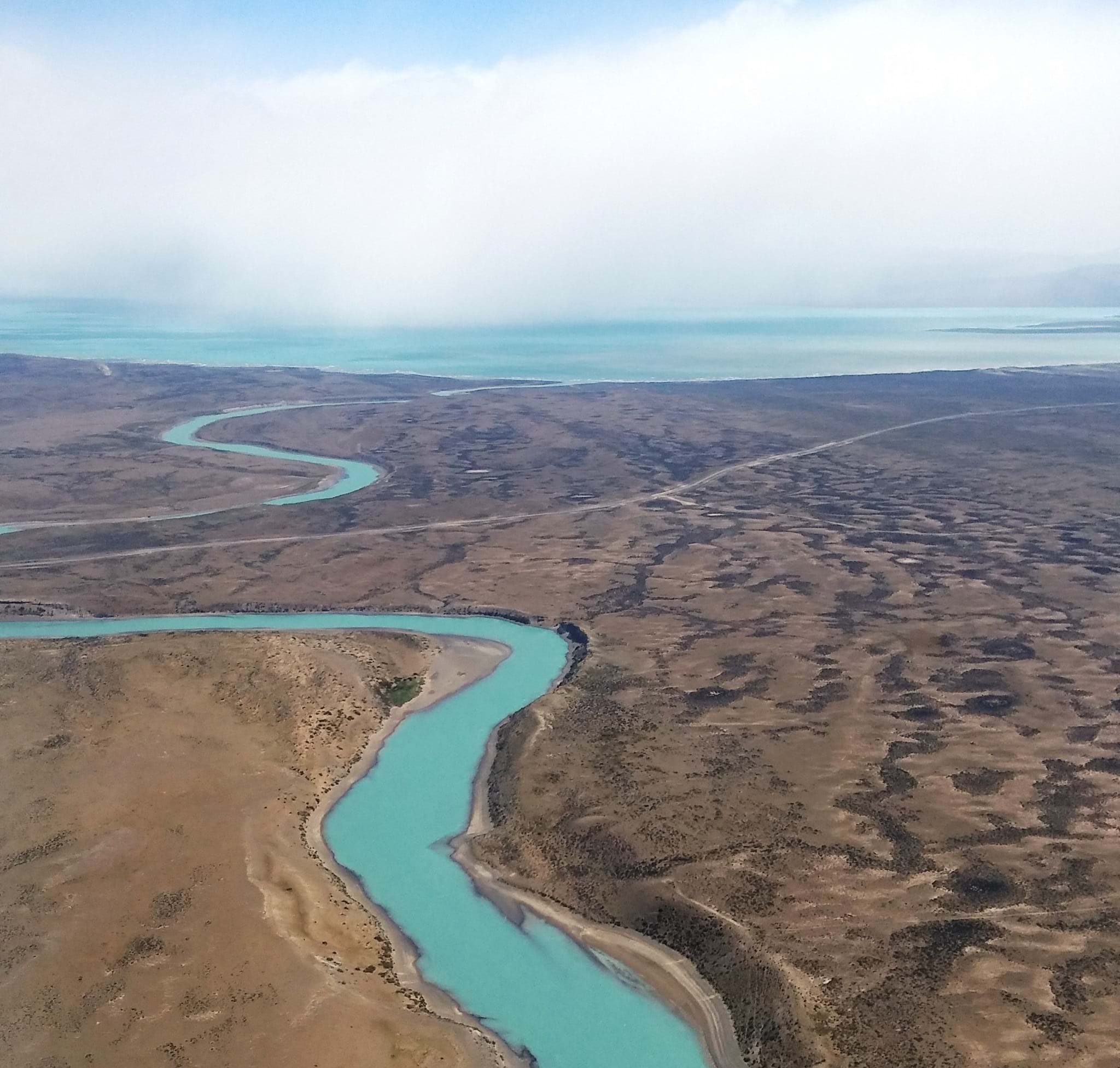 Wir fliegen diesmal vom nationalen Flughafen ab. Dieser liegt in der Stadt am Meer, und wir brauchen nur fünfzehn Minuten dorthin. Der Flug dauert 3:40 Stunden, und unterwegs sieht man das große Nichts, nichts als die Weite der Steppe, manchmal durchzogen von türkisfarbenen Flüssen.