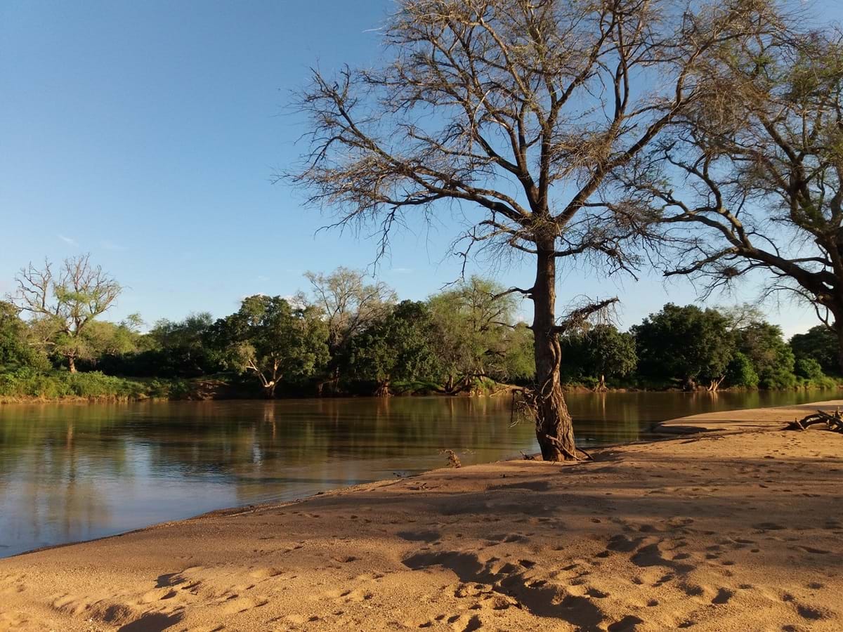 Am frühen nächsten Morgen sind wir unterwegs zum Wildpark Tuli Block an der Grenze zu Südafrika, getrennt durch den Limpopo Fluss. Wir kommen gut durch und erreichen am Nachmittag das Molema Camp. Kleine saubere Hütten oder Campingplätze gibt es hier. Schon bei der Anfahrt stehen unglaublich viele Elefanten neben uns in den Büschen. Unsere Hütte hat einen Blick auf den Fluss und am Tage dürfen wir auch auf dem Strand ein wenig auf und ab laufen „aber immer auf das Umfeld achten, nicht weit laufen und auf gar keinen Fall im Dunklen!!!“ Zum Kochen fahren wir zum Haupthaus. Dort ist die gut ausgestattete Küche. Wir sind die einzigen Gäste und es ist sehr romantisch, abends am Lagerfeuer zu sitzen in den Sternenhimmel schauen und von einer Zigarette träumen.