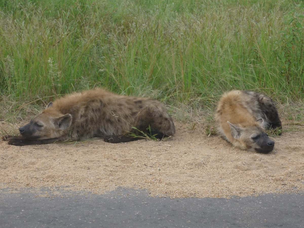 Am frühen Morgen stoßen wir auf dösende Hyänen, vielleicht noch satt vom großen Fang in der Nacht, Sie lassen sich absolut nicht von uns stören. Immer wieder treffen wir auf Elefanten, die unseren Weg kreuzen und uns nicht beachten.