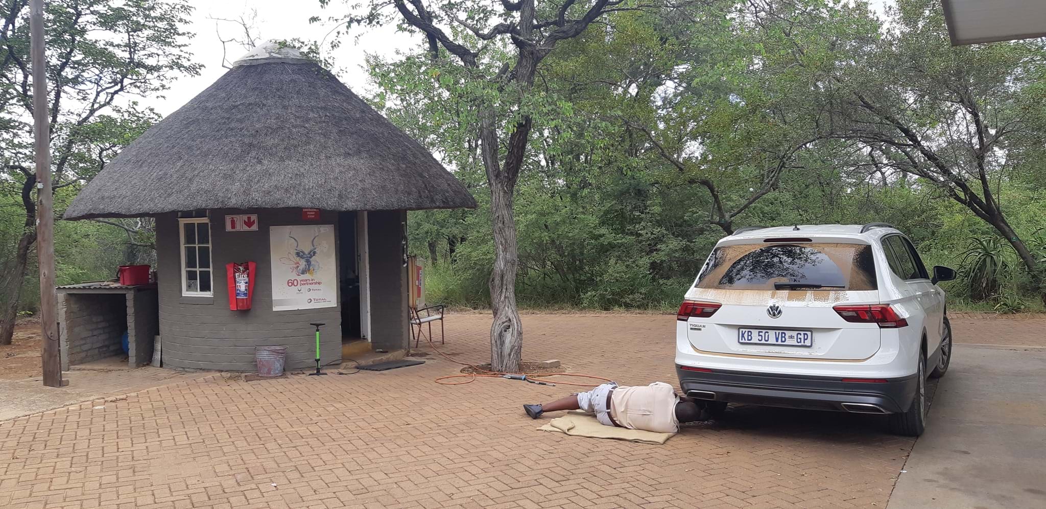 Genau. Der Luftdruck war vom Techniker der Autovermietung sorgfältig geprüft und eingestellt worden. Den Rest erledigte der freundliche Tankwart im Kruger Park: Jacket ausgezogen, Ärmel hoch, Krawatte weggesteckt und nach einer knappen Stunde ist der Reifen geflickt und per Handpumpe nachhaltig auf drei Bar gebracht.