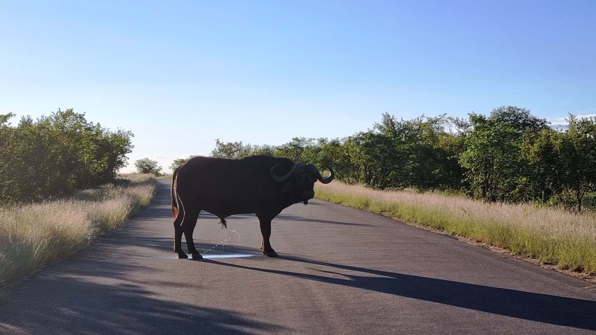 Unsere Tour führt uns heute über Letaba nach Olifants Camp, vorbei an Flüssen und Felsformationen. Es ist durchaus eine reizvolle Gegend. Es wird schnell sehr heiß und unterwegs entdecken wir nach kurzer Zeit die ersten Tiere wie Elefanten, Zebras und Giraffen. Eine Herde Wasserbüffel läuft vor uns her, ein kräftiger Bulle bleibt stehen, dreht sich um, starrt uns gelangweilt an und lässt erstmal einen gewaltigen Strahl von frischem Morgenurin auf den Asphalt laufen. Willkommen im Kruger Park!