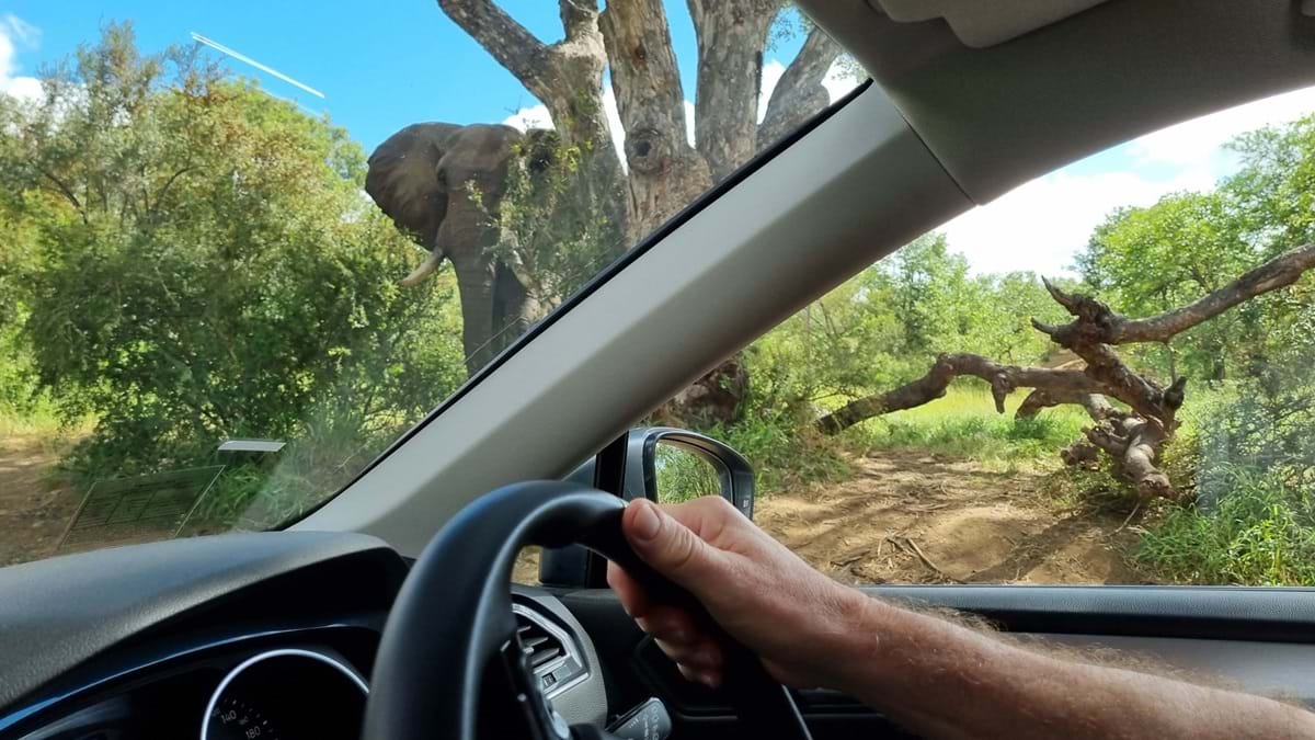 Unser Auto ist dieses Mal ein VW Tiguan. Man erwartet uns bereits, wir erhalten ihn schnell und er ist in gutem Zustand. Der Techniker ist stolz darauf, auch den Reifendruck korrigiert zu haben, doch dazu später mehr. Wir hatten uns für ein Auto mit etwas Bodenfreiheit entschieden, da viele Straßen - gerade in den Parks - unbefestigt sind. Ein 4&4 Fahrwerk ist in den „entwickelten“ Regionen Südafrikas nicht nötig. Und noch auf dem Gelände des Flughafens begegnen uns die ersten Tiere: Eine Schildkröte, drei Giraffen und eine kleine Herde Impalas. Das fängt ja gut an! Achtung - und bei all dem Staunen und Schauen nicht vergessen: Immer auf der linken Seite fahren, denn hier herrscht Linksverkehr!